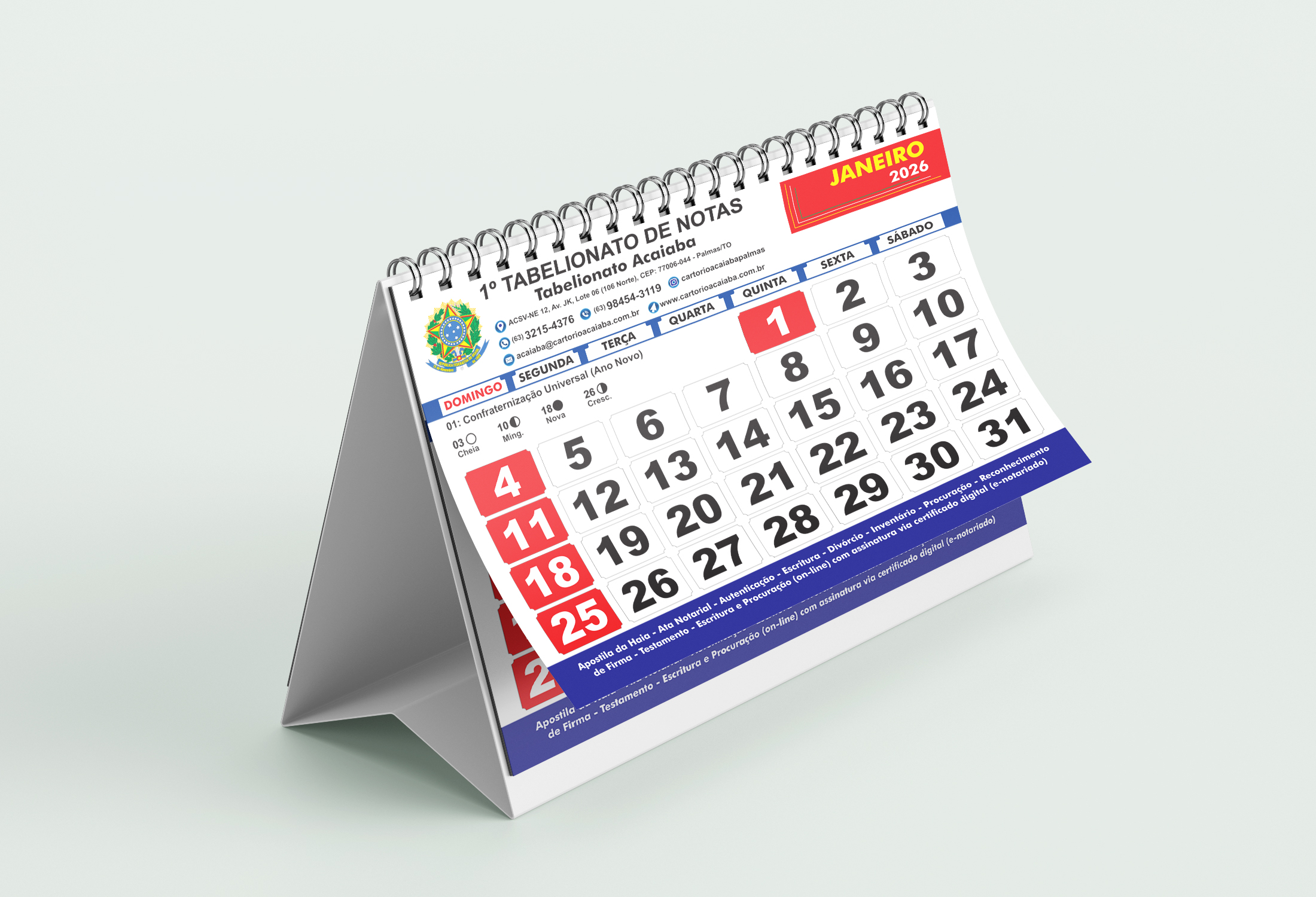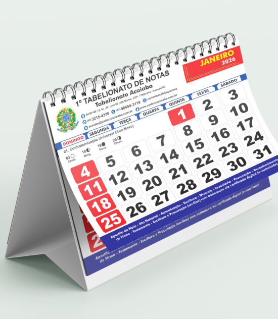 O calendário personalizado é uma das formas mais práticas de manter sua marca presente no dia a dia dos clientes. Seja de mesa, de parede ou de bolso, ele oferece utilidade e divulgação o ano inteiro. Personalizamos com sua logo, cores e informações importantes da sua empresa.